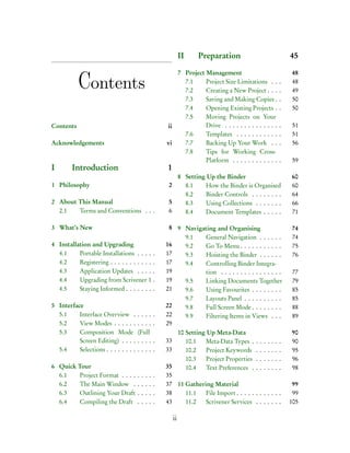 This user manual provides instructions for using Scrivener 2.1 software. It includes sections on installation and interface overview, project management, outlining and organizing documents, writing and editing tools, compiling drafts into final formats like PDF and HTML, and customizing preferences. The manual contains over 400 pages with detailed explanations and screenshots to help users maximize the power of Scrivener for drafting, organizing, and compiling a variety of creative works and documents.