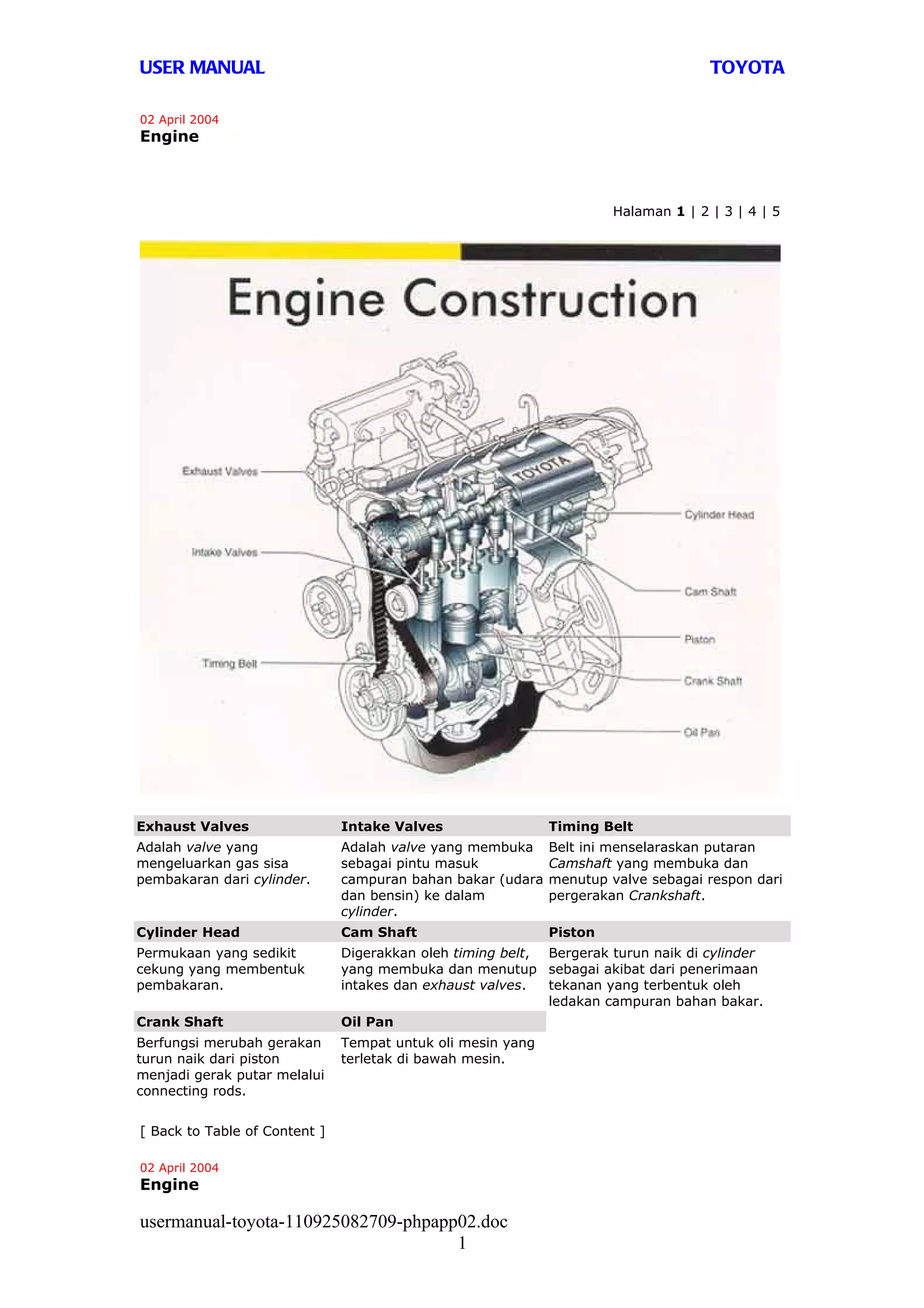 Manual pengguna Toyota ini memberikan informasi tentang berbagai komponen mesin, transmisi, sistem pengereman, suspensi, dan sistem pendingin udara, serta menjelaskan fungsi dan mekanisme kerja masing-masing. Selain itu, juga terdapat penjelasan mengenai klasifikasi oli dan perawatan kendaraan, termasuk pentingnya mengganti oli dan ban. Dokumen ini berisi panduan penting untuk pemilik kendaraan Toyota dalam memahami dan merawat kendaraan mereka.