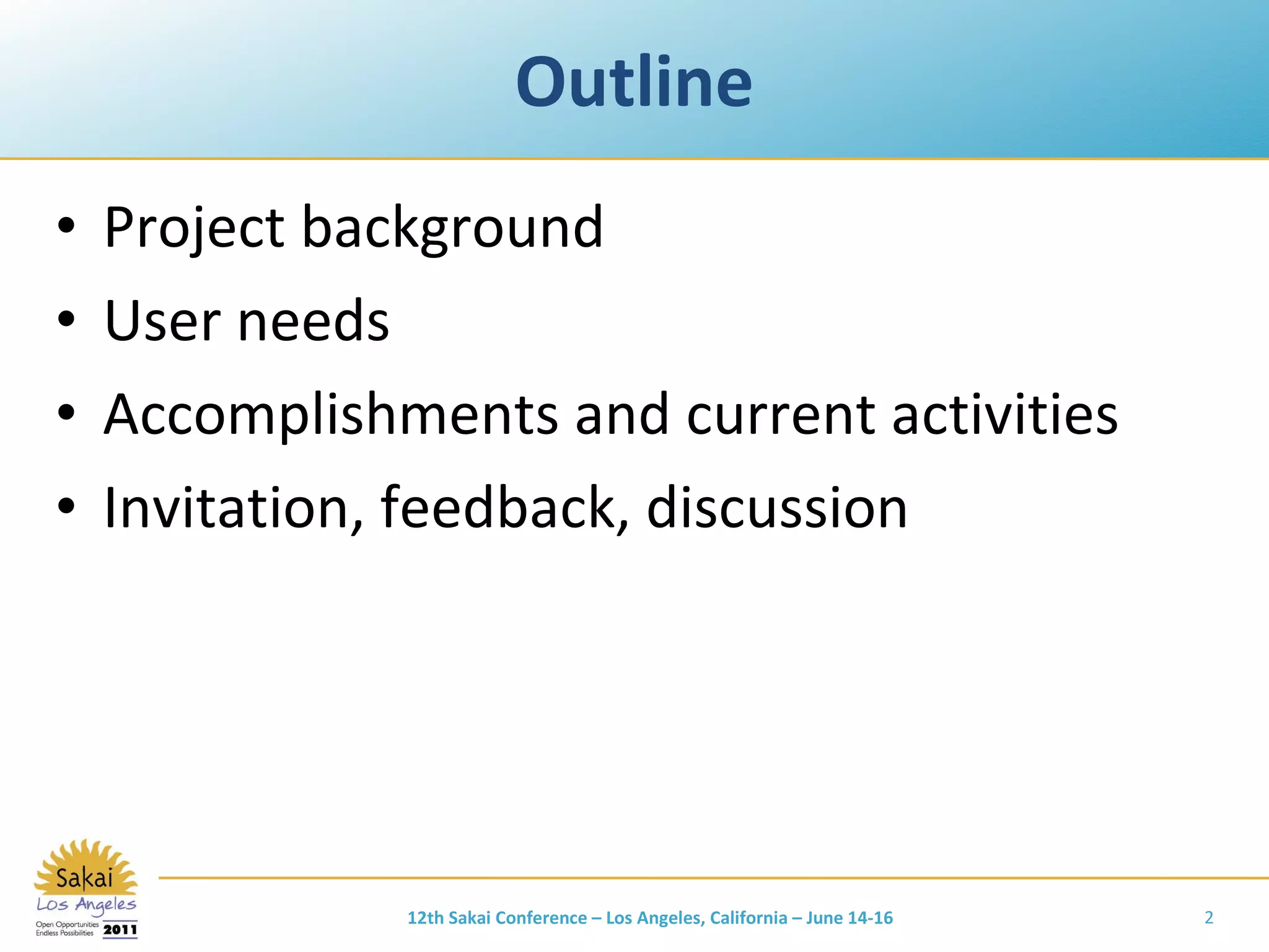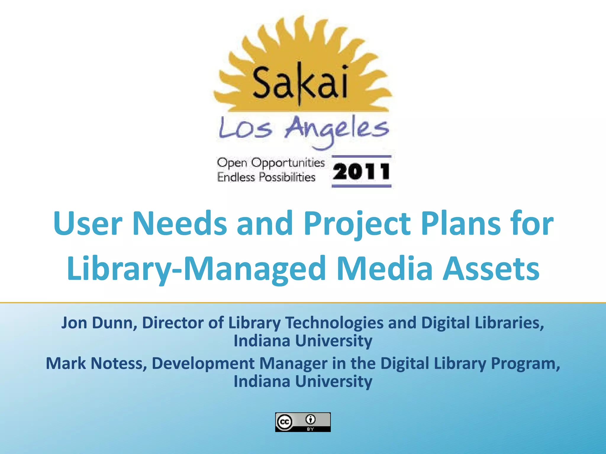 The document outlines a project presented at the 12th Sakai Conference, focusing on the development of an open-source digital music and video library system utilized at various institutions, including Indiana University. It discusses user needs for video streaming solutions, highlighting essential features such as precise playback control and mobile access, as well as gaps in current systems regarding integration and functionality. The project aims to enhance access to managed media assets through collaboration and feedback, with a vision for improved educational tools and resources.
