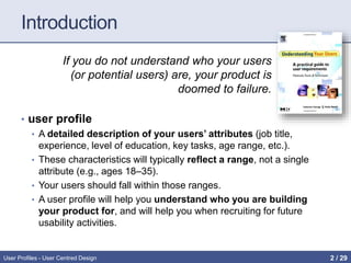 The document discusses user profiles and personas, which are tools used in user-centered design to represent and understand target users. It provides guidance on creating user profiles, including defining a range of user attributes and types of users. Personas are introduced as archetypes of user profiles that make users more relatable. The document outlines how to develop personas through storytelling to foster empathy, and provides examples of persona templates.