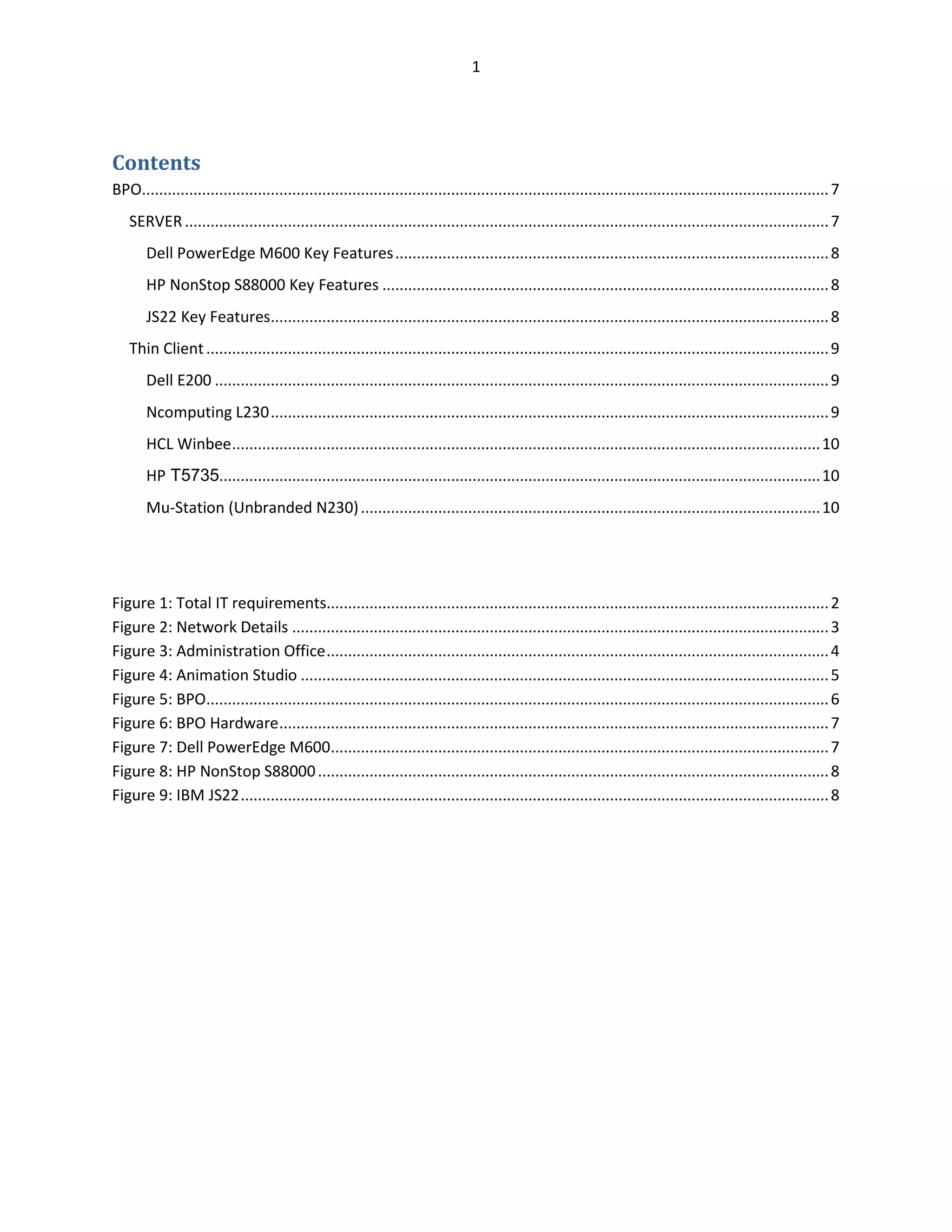 The document discusses the total IT requirements for an organization including their network, hardware, software needs for their administration office, animation studio and BPO department. It provides details on the core and edge network setup as well as the server and thin client hardware requirements for the BPO which includes Dell PowerEdge M600, HP NonStop S88000, and IBM JS22 servers as well as Dell, Ncomputing, HCL, HP and unbranded thin client options. Key features of the Dell, HP and IBM servers are highlighted.