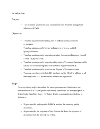 This document outlines user requirements for a document management system for Health First Pharmaceutical Company's Manufacturing Division. It defines requirements for document submission, review, approval, metadata migration from current systems, and record retention. The system must support ISO and cGMP compliance. Key user types are identified along with their access levels and needs. Document library structure and metadata requirements are also specified.