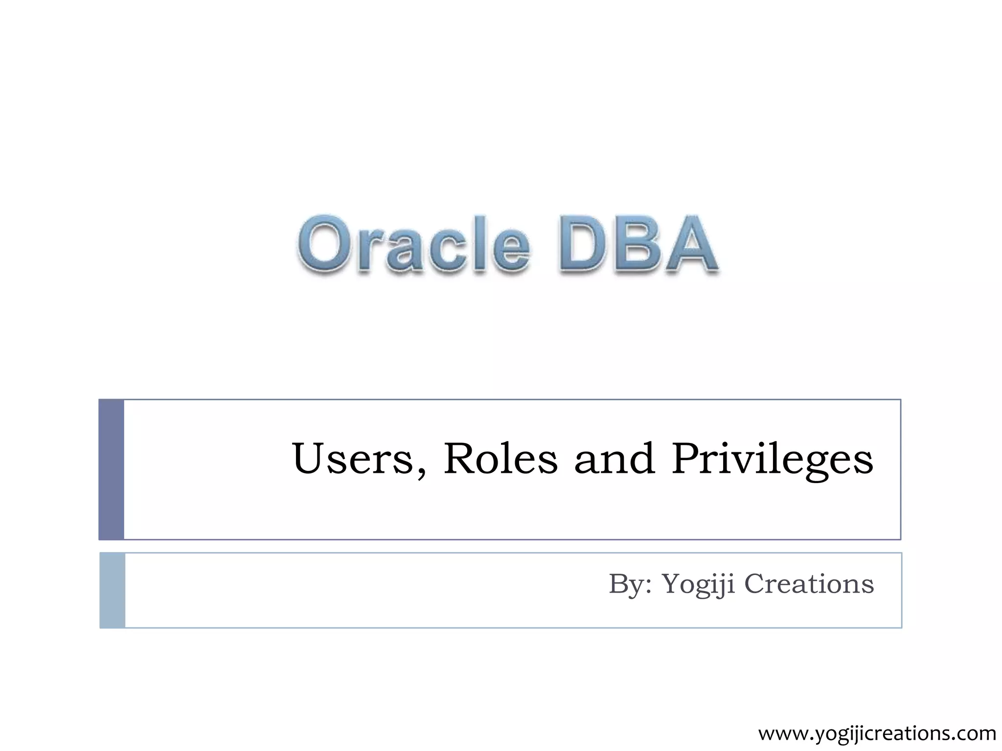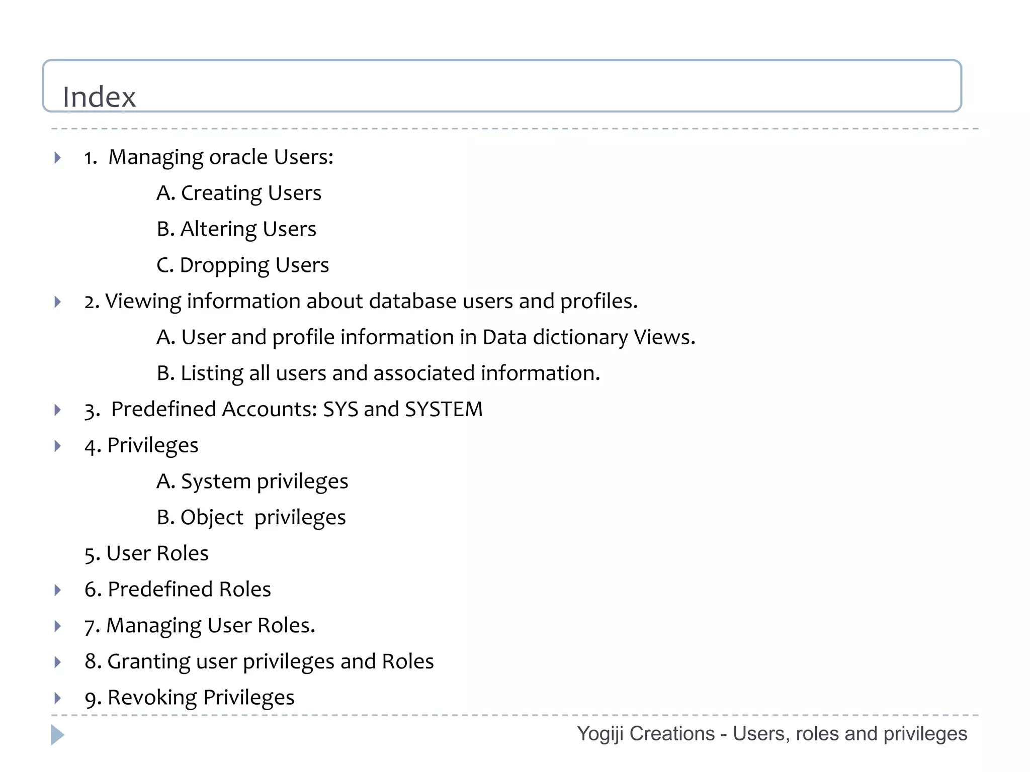 The document discusses managing users, roles, and privileges in Oracle databases. It covers creating, altering, and dropping users, viewing user information, predefined user accounts, different types of privileges including system privileges and object privileges, and user roles. It provides examples and descriptions of commands for working with users, roles, and privileges in Oracle databases.