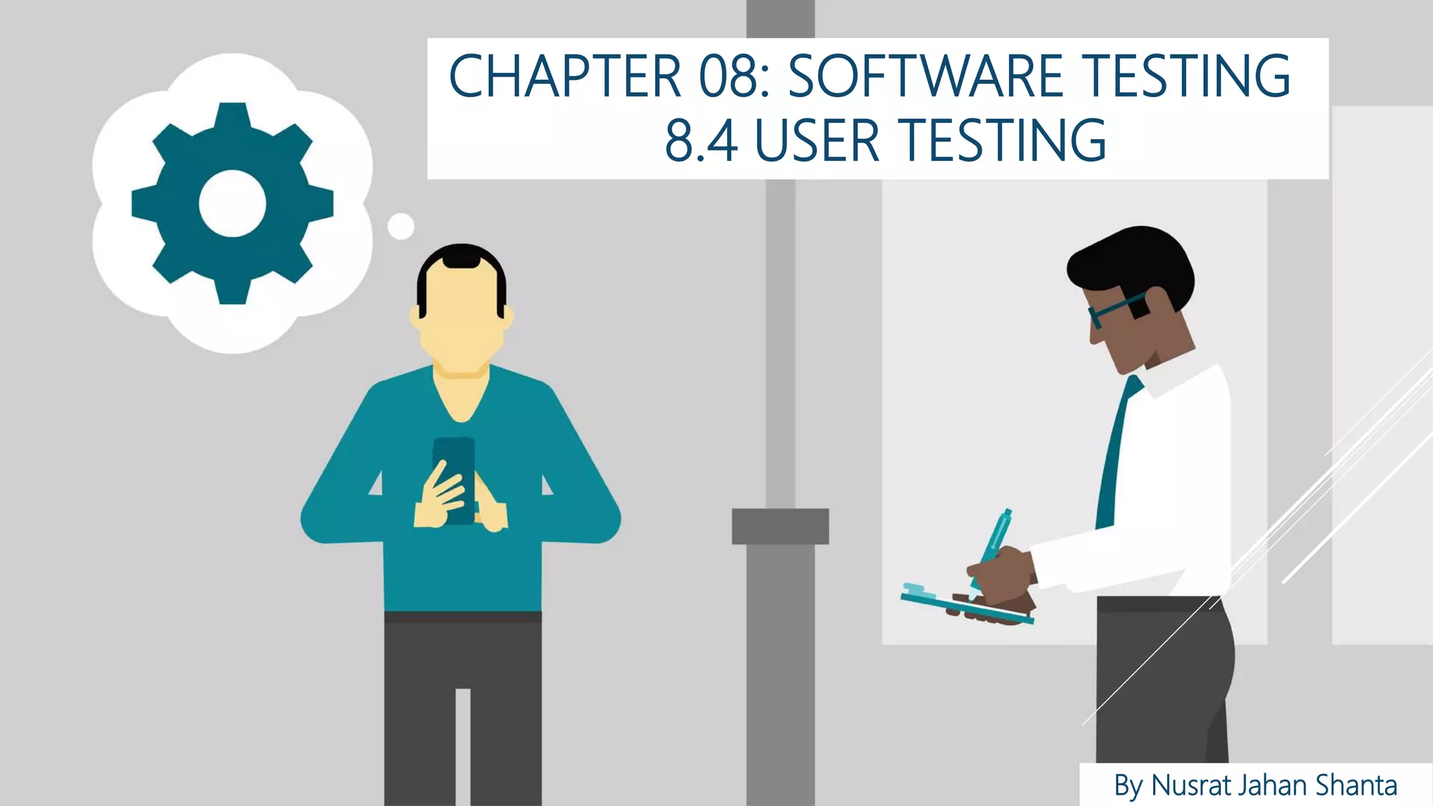 User testing involves testing a software product by actual users to identify any issues. There are three main types of testing: alpha testing which is conducted internally by developers, beta testing which is done by a set of external users, and acceptance testing which is done by the client prior to final release to verify if the software meets requirements.