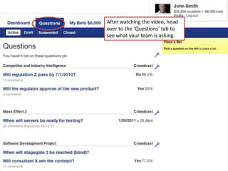 This document provides instructions for participating in a prediction marketplace where employees can weigh in on questions about projects, place bets on outcomes, and see how their predictions compare to peers on a leaderboard. Key steps include viewing open questions, reading colleagues' comments and placing bets, joining conversations, and checking back regularly to update predictions. The goal is to help executives get insights into teams' beliefs and keep projects on track.