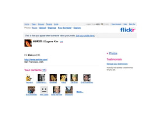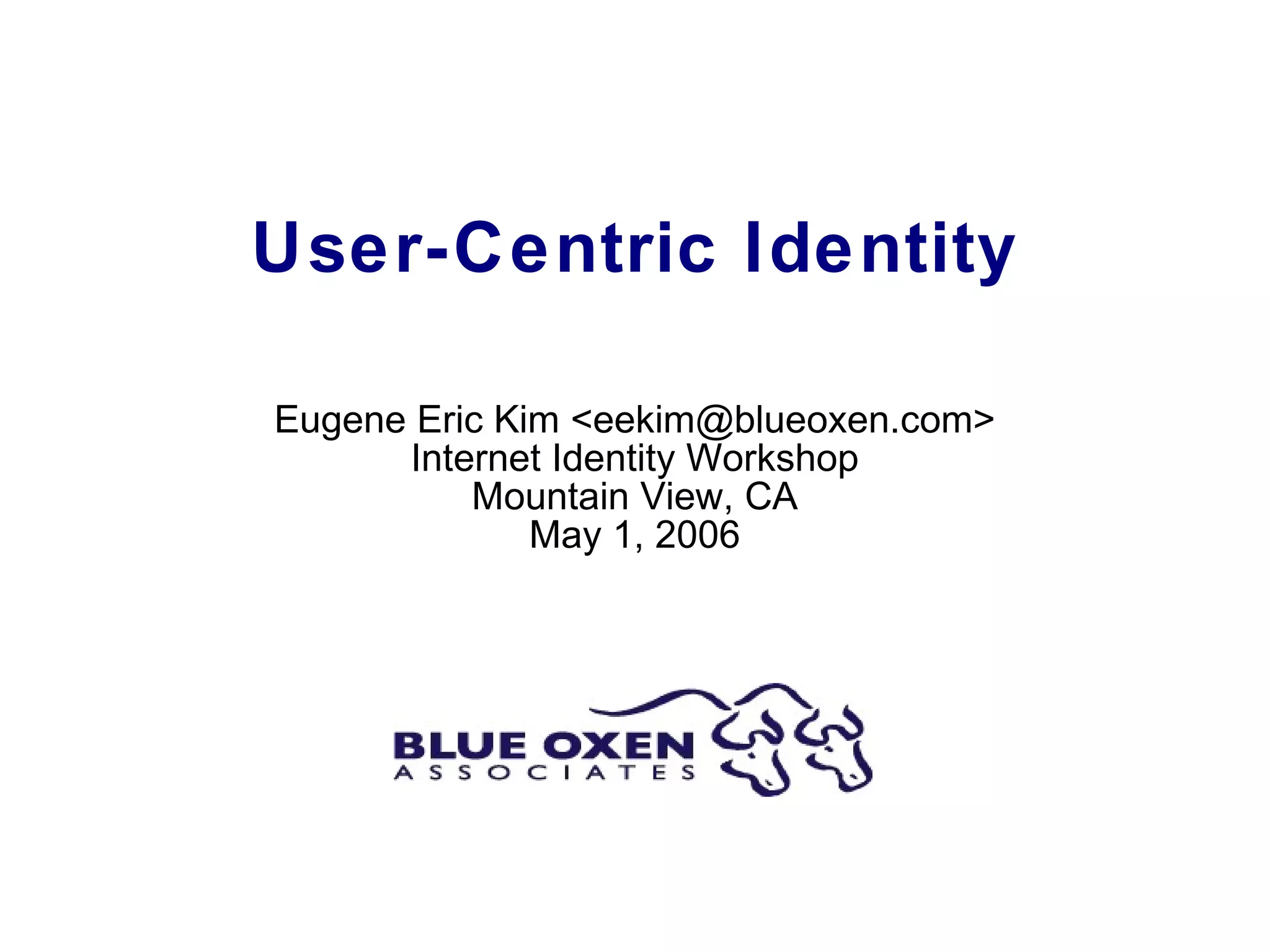 User-centric identity refers to individuals having control over their own digital identities and reputations online rather than relying on centralized third parties. The document discusses how a user-centric model where people control digital claims made about themselves could have social and technical implications, and provides some community resources on the topic including blogs and websites discussing identity issues.