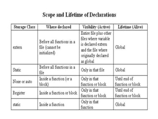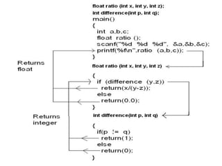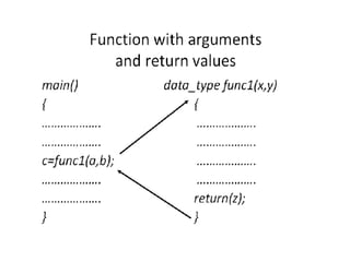 2) Functions can be classified based on whether they have arguments and return values. The main categories are functions with no arguments and no return, functions with arguments but no return, and functions with arguments and a return value.