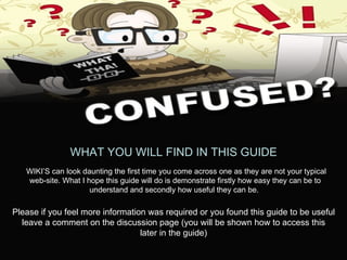 This document is a user guide for wikis that provides information on what wikis are, how they can be used, and how to navigate and participate in a wiki. It explains that wikis are websites that users can collaboratively create and edit. It describes how users can leave comments on discussion pages, alter wiki pages by becoming a member, and create their own wikis. The guide also outlines how to navigate between wiki pages and sections, and explains that wikis can contain unlimited pages and media like videos and presentations.