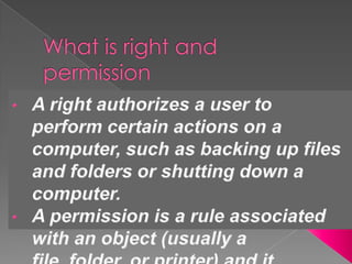 Local users and groups allow management of user accounts and permissions on a Windows computer. Users can be assigned to predefined groups like Administrators, Power Users, and Users that determine their privileges. Administrators have the most control while Users have limited standard abilities. Groups simplify security by applying permissions to collections of users rather than individual accounts.