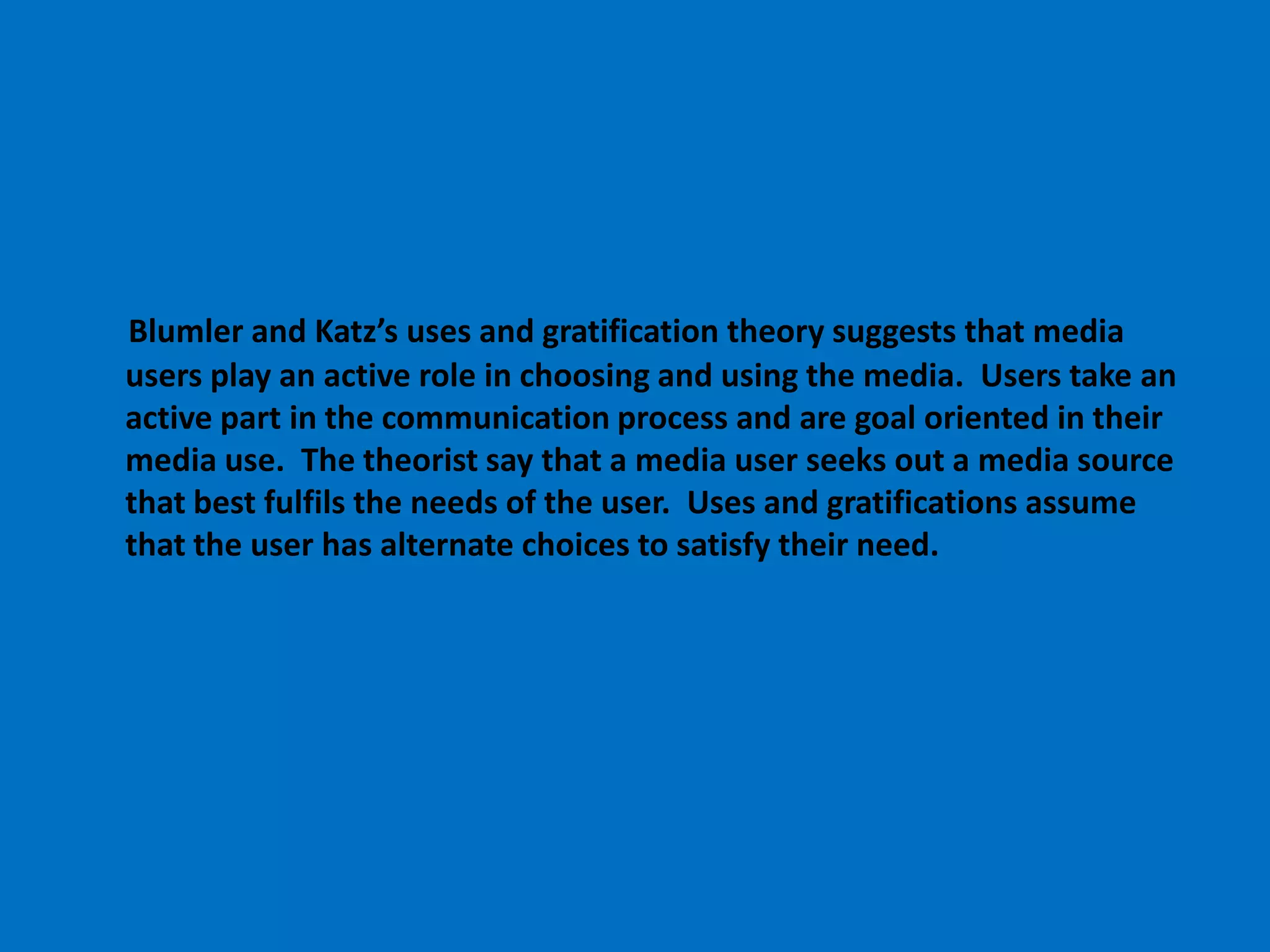 Uses and Gratification theory suggests that media users actively select and use media to fulfill certain needs and goals. According to the theory, users take an active role in the communication process by seeking out media that satisfies their needs, which can include needs for information, personal identity, social interaction, and entertainment. The theory assumes users have choices and will select the media that best fulfills their particular needs.