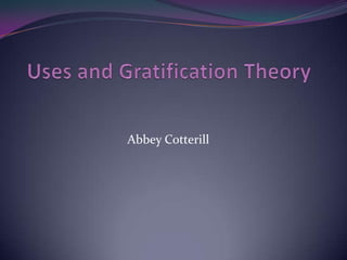 The document summarizes the history and key aspects of uses and gratifications theory. It explains that in the 1960s, media theorists recognized that audiences were active rather than passive in their media consumption. In 1948, Lasswell proposed four main functions of media texts: surveillance, correlation, entertainment, and cultural transmission. Katz and Blumler later expanded on this in 1974 to include personal relationships, personal identity, and diversion as reasons individuals consume media. Finally, the document notes that uses and gratifications theory focuses on understanding what audiences want from media texts and how they use and are affected by them.