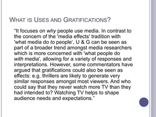 Uses and gratifications theory focuses on why people use media and what people gain from media use, rather than how media affects people. It recognizes that people can have varied responses to and interpretations of media. Some benefits people seek from media include information, entertainment, social interaction, and personal identity. Specific gratifications identified include escape from problems, learning, social interaction, and emotional release.