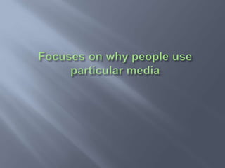 Uses & Gratification Theory focuses on why people use particular media and what people do with media rather than what media does to people. It argues that people's needs influence how they use and respond to media. The theory was developed in the 1960s as media researchers became interested in what audiences did with media and how individuals actively consumed media to fulfill different needs and reasons. Blumer and Katz expanded on this theory in 1974, identifying specific purposes audiences may have for media use such as diversion, personal relationships, identity, and surveillance.