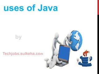 Java is used widely in various domains including Android apps, server-side applications, web applications, software development tools, trading applications, embedded systems, scientific applications, and high frequency trading. Some major uses of Java include powering Android apps, financial services applications, backend server applications, IDEs like Eclipse and IntelliJ, and trading software. Java remains popular for applications that require performance, reliability, security and cross-platform capabilities.