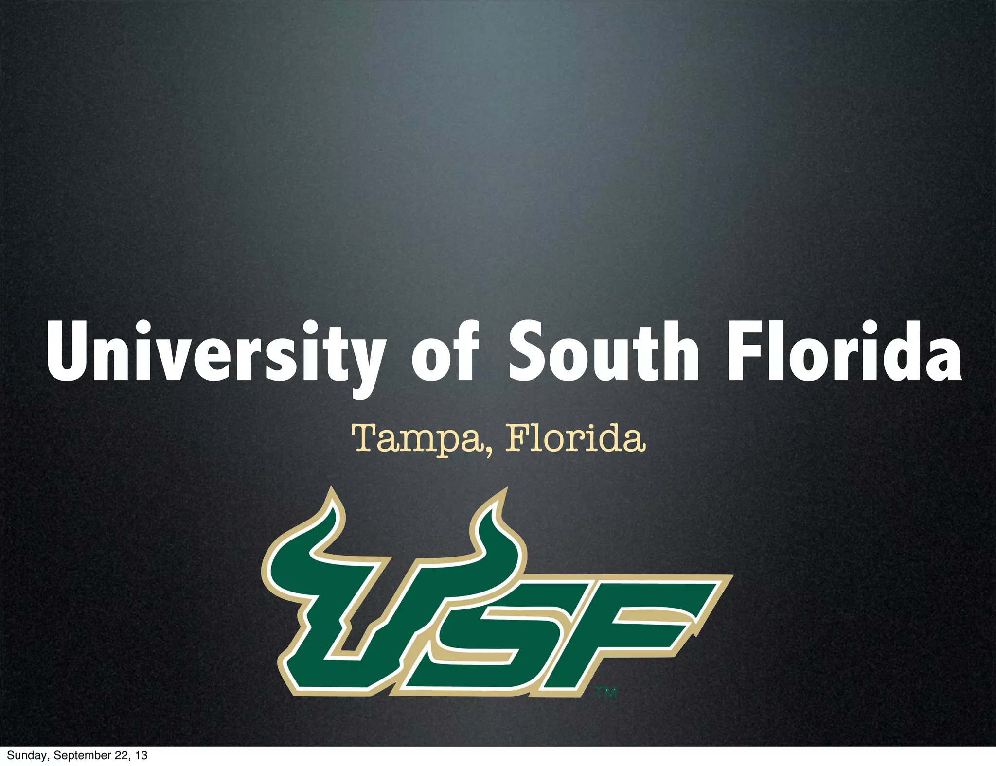 The University of South Florida is a public university located in Tampa, Florida with additional campuses in St. Petersburg and Sarasota. It has an average undergraduate enrollment of 30,289 students, offers bachelor's, master's, and doctoral degrees, and has an acceptance rate of 43% with an average GPA and test scores for admitted freshmen. The school provides $10,143 in average financial aid and has a student to faculty ratio of 27:1.