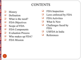 This document provides an overview of the United States Food and Drug Administration (USFDA). It discusses the history and definition of the USFDA, its objectives to ensure safety of foods, drugs, cosmetics and medical devices. It outlines the various components of the USFDA including the Center for Drug Evaluation and Research (CDER), Center for Food Safety and Applied Nutrition (CFSAN), and Center for Veterinary Medicine (CVM). It also discusses the FDA's evaluation process, mission, laws enforced, and activities regulated.
