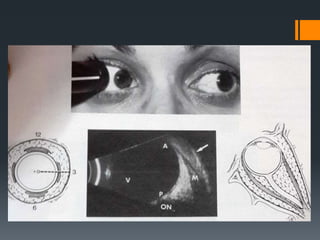 Ultrasound is a useful tool for evaluating orbital diseases. It uses high frequency sound waves to create images of intraocular and orbital structures. A systematic ultrasound examination involves evaluating the orbital soft tissues, extraocular muscles, and retrobulbar optic nerve. Abnormalities are identified based on changes in location, size, shape, internal reflectivity, and mobility compared to the normal structures. This allows differentiation of various pathologies, such as cysts, masses, muscle thickening, and optic nerve swelling. A comprehensive ultrasound examination provides valuable information for diagnosing and monitoring orbital diseases.