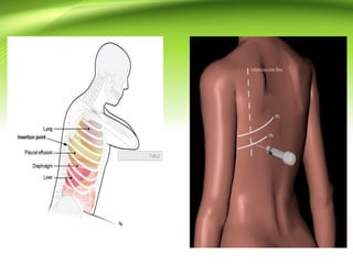 USG guided thoracentesis is a procedure to aspirate pleural fluid using ultrasound guidance. It has several advantages over non-US guided thoracentesis, including being highly accurate which decreases complications. The key steps are to identify pleural anatomy like fluid, diaphragm and lung under ultrasound and then perform the procedure under real-time visualization of instruments to safely drain fluid. Post procedure chest x-ray is done to identify any complications like pneumothorax. USG guidance improves safety and accuracy of characterizing pleural disease and draining pleural fluid.