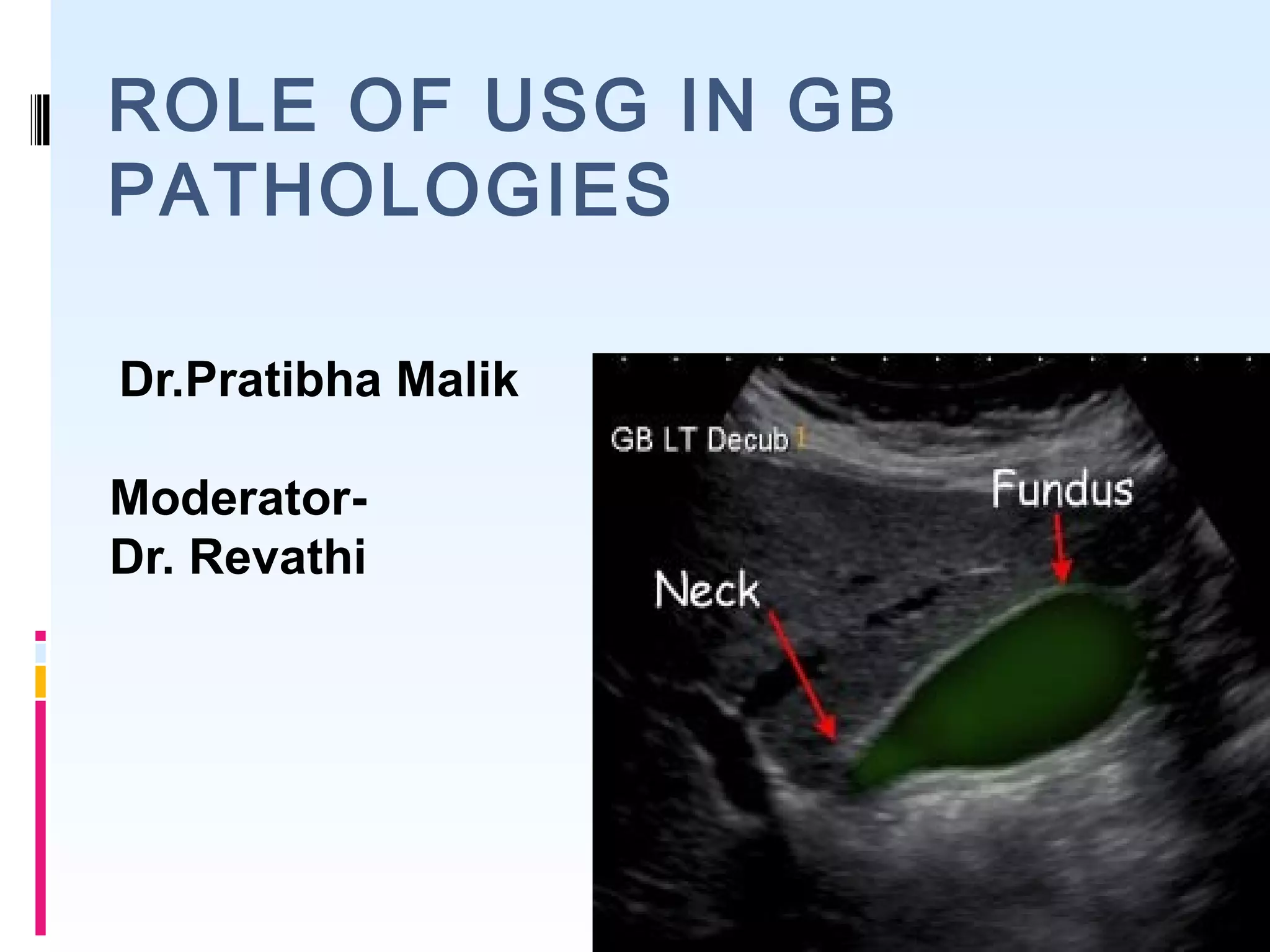 This document discusses the role of ultrasound in evaluating gallbladder pathologies. It begins by covering normal gallbladder anatomy and variants. Key pathological findings that can be identified on ultrasound include gallstones, sludge, cholecystitis, polyps, gallbladder cancer, and bile duct stones. Specific ultrasound findings that help characterize these various conditions are presented. The document also reviews ultrasound evaluation of the biliary tract, including assessment of the bile ducts and conditions like Mirizzi syndrome.