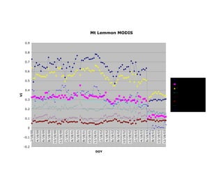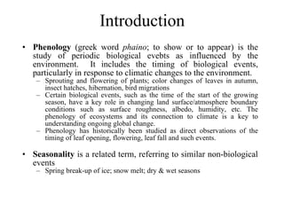 This document discusses remote sensing of phenology, which is the study of periodic biological events and their relationship to climate and environment. Satellite imagery can be used to observe seasonal landscape dynamics over large areas by analyzing time-series vegetation index data. Key phenological metrics like start of season, end of season, and duration of growing season can be derived from this data. This provides insights into how plant life cycles respond to climate change at regional scales.