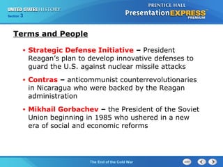 Ronald Reagan challenged communism through military buildup and supporting anti-communist groups. Mikhail Gorbachev later implemented reforms in the Soviet Union through glasnost and perestroika. This led Eastern European nations to abandon communism in 1989, symbolized by the fall of the Berlin Wall, ending the Cold War. However, the US continued facing challenges in the Middle East and a foreign policy scandal known as the Iran-Contra affair damaged Reagan's reputation.