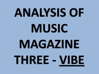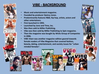Vibe is a music and entertainment magazine founded by Quincy Jones in 1993. It features R&B and hip hop artists. The target audience is young, urban followers of hip hop culture aged 18-34. Vibe uses a consistent house style with colors like black, grey, and white to portray an image that is informal yet stylish and modern, reflecting the genres of music it covers.