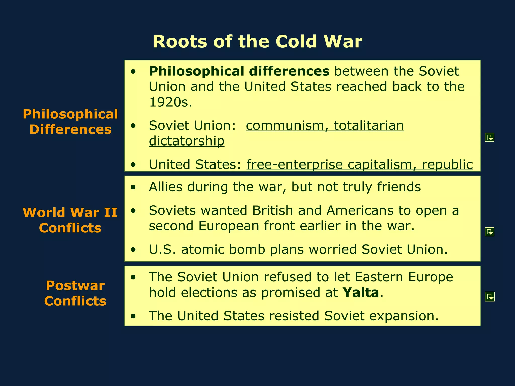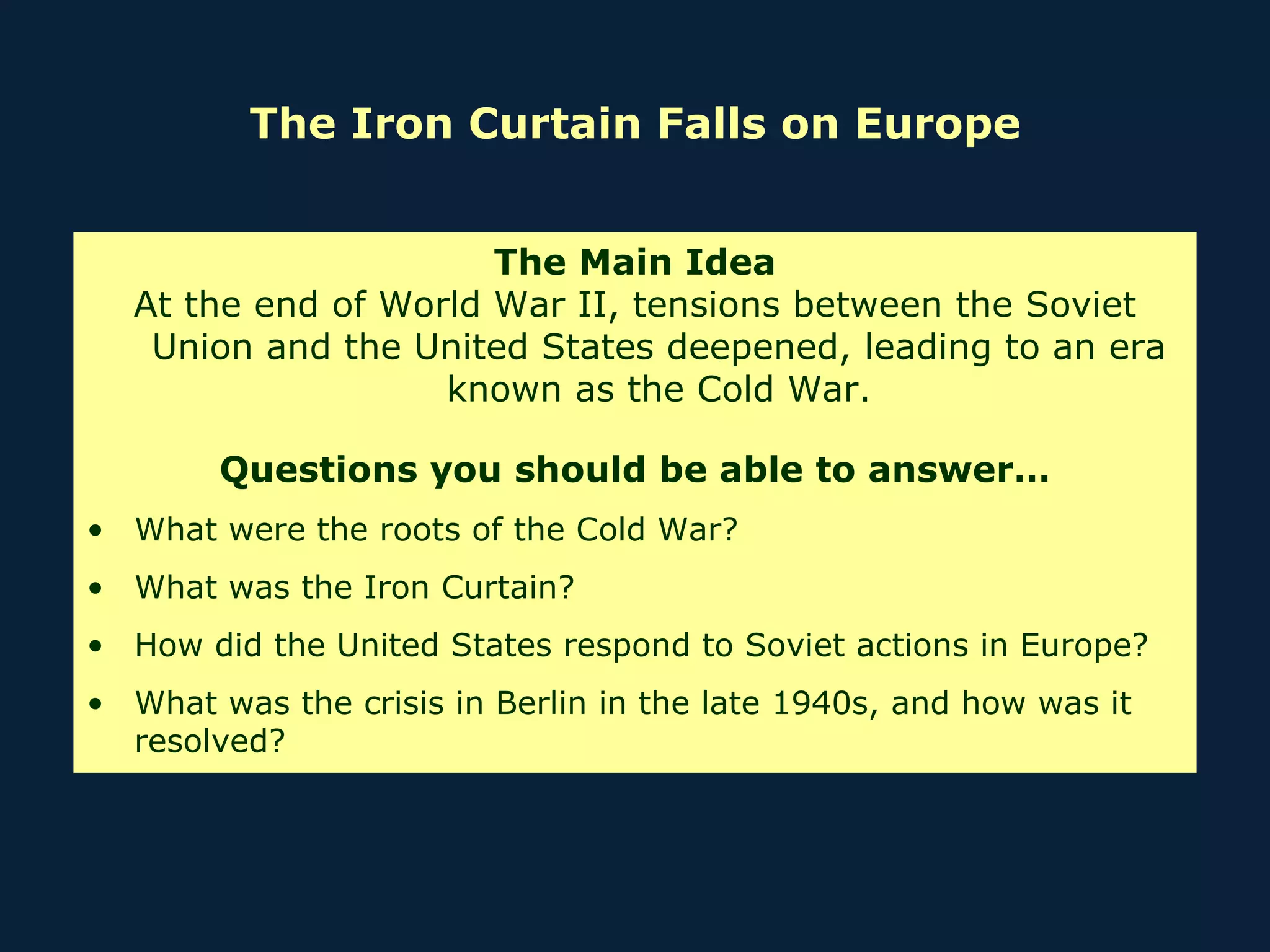 The document discusses the rise of tensions between the Soviet Union and Western allies like the United States following World War II, leading to the Cold War era. It describes how the Soviet Union exerted control over Eastern Europe by installing communist governments and suppressing opposition. The West responded through policies like the Truman Doctrine and Marshall Plan to contain Soviet expansion and rebuild Western Europe. It also discusses the Berlin Blockade crisis of 1948-1949 and the formation of NATO in response to Soviet actions.