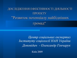 ДОСЛІДЖЕННЯ ЕФЕКТИВНОСТІ ДІЯЛЬНОСТІПРОЕКТУ ”Розвиток потенціалу найбідніших громад“ Центр соціальних експертиз Інституту соціології НАН України Доповідач - Олександр Гончарук Київ 2009