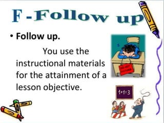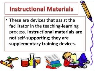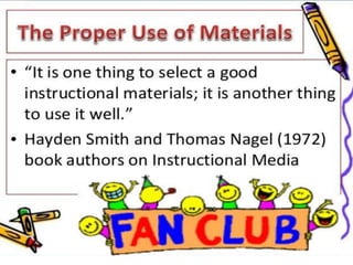 The document provides guidelines for selecting instructional materials. It lists 4 questions to consider: 1) Do the materials give a true picture of the ideas presented? 2) Do the materials contribute meaningful content to the topic? 3) Is the material appropriate for the learners' age, intelligence, and experience? 4) Is there a teacher's guide to provide effective use of the materials? The document was prepared by Recel D. Victoriano for Lesson 6 on the selection of materials.