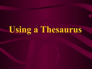 A thesaurus is a book that lists words and their synonyms to help find alternative words. It can be used to replace nouns like "baby" with "infant" or "child", verbs like "walked" with "strolled" or "ambled", adjectives like "happy" with "merry" or "gleeful", and adverbs like "eagerly" with "excitedly" or "avidly". The document provides an example of using a thesaurus to replace words in the sentence "The happy baby walked eagerly around the room" with synonyms.