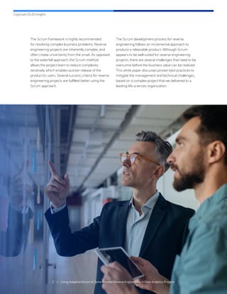 The document discusses the use of adaptive scrum to enhance reverse engineering processes in data analytics projects, highlighting its benefits over traditional waterfall methods. It outlines how scrum's iterative approach can help organizations effectively manage complexities and reduce functional, technical, and operational debts associated with legacy applications. Various challenges and best practices for successful implementation of reverse engineering using scrum are also examined.