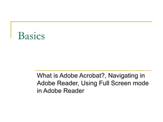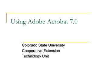 This document provides an overview of how to use Adobe Acrobat 7.0 to create and edit PDF documents. It discusses converting documents from Microsoft Office and other formats into PDF, combining multiple documents, adding bookmarks, comments and other annotations, optimizing files for print/web/email, and basic editing of PDF pages and objects.