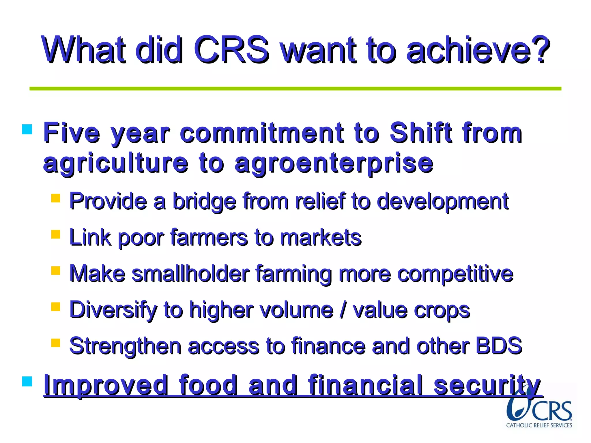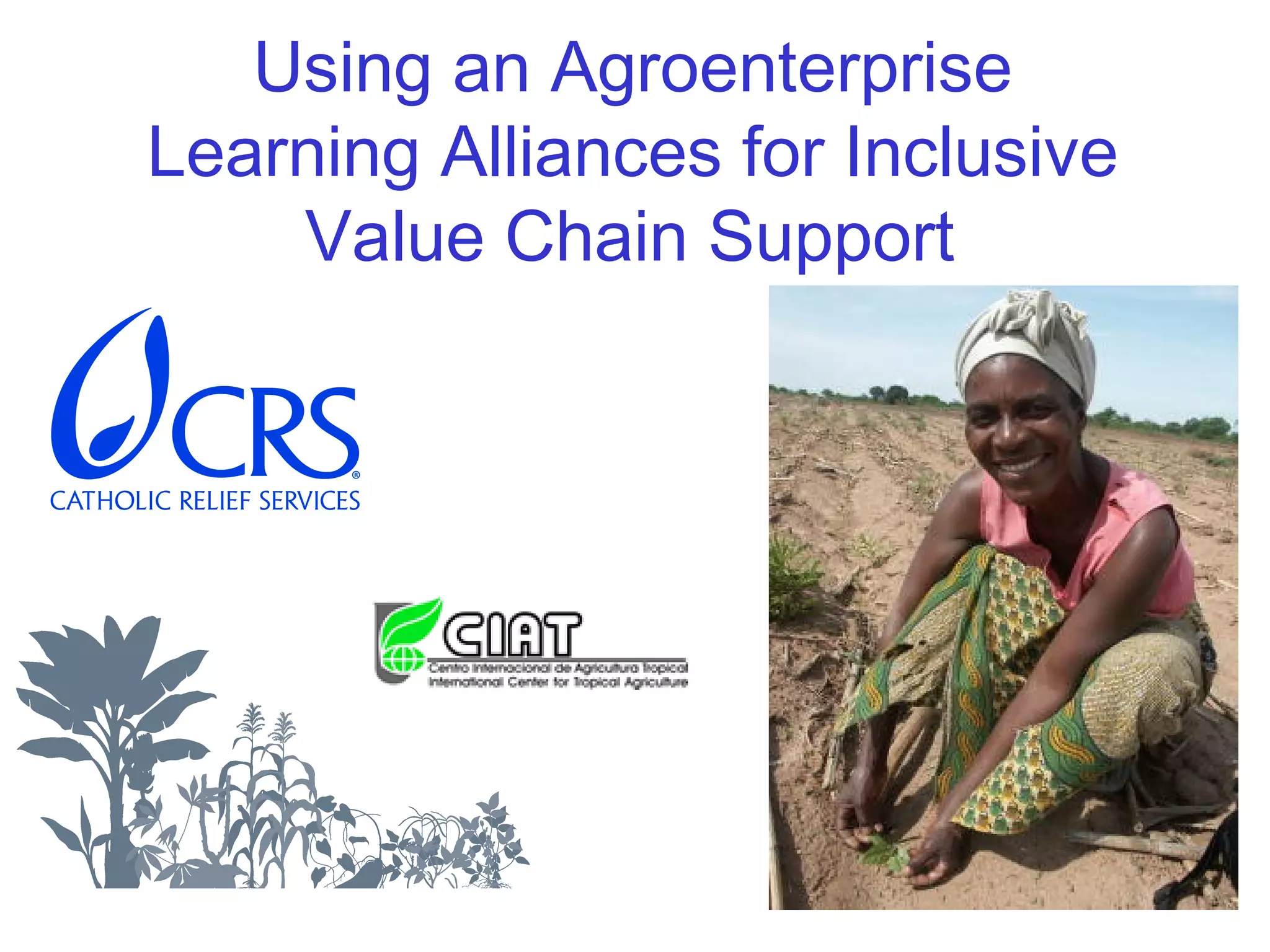 CRS implemented Agroenterprise Learning Alliances over 5 years to help shift smallholder farmers from subsistence agriculture to competitive agroenterprise. The goal was to provide a bridge from relief to development by linking farmers to markets, diversifying crops, strengthening access to finance and services, and improving food security. Key aspects included participatory value chain development, multi-skill training for farmer groups, savings mobilization, strengthening local service providers, and integrating infrastructure, training and marketing linkages. Case studies in navy beans in Ethiopia and chickpeas in Tanzania showed increases in farmers, crops, and collective marketing. Challenges remained around skills transfer, farmer organization, value chain analysis, access to finance and information for rural