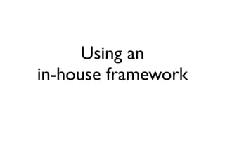 The document discusses enhancing WordPress theme development using an in-house framework for efficiency and security. It outlines the desired features and requirements, such as pre-registering CSS and JS files and ensuring functionality common across sites. Additionally, it emphasizes community engagement and maintaining updates and bug fixes for previous customers.