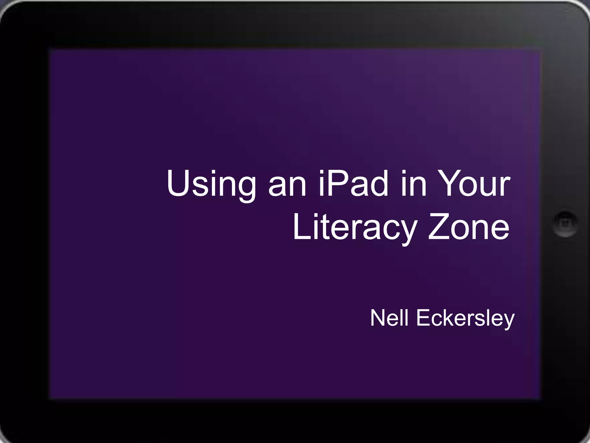 This document provides an overview of using iPads in literacy education. It discusses buying iPads in bulk, navigating the iPad interface, and recommended apps for literacy learning including ebooks, note-taking, flashcards, and math games. Suggested websites are also provided for finding educational apps and iPad resources. The document concludes with contact information for the author.