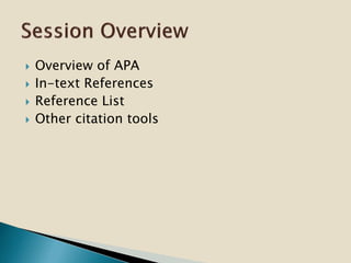 The document outlines citation guidelines and tools in APA style, highlighting its importance for academic integrity and good research practices. It provides detailed information on how to format references, in-text citations, and various citation types across different mediums. Additionally, resources for further guidance and citation management software options are included.