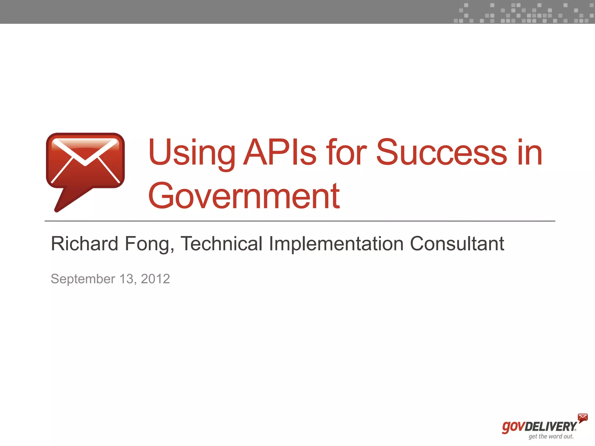 The document presents an overview of APIs and their significance in government digital communications, highlighting how they enable efficient data exchange between systems. It details the features and benefits of the GovDelivery API, including various success stories from public sector organizations that have used it to enhance their communication strategies. The presentation concludes with an invitation to a related upcoming event focused on digital government and communications.
