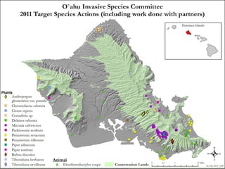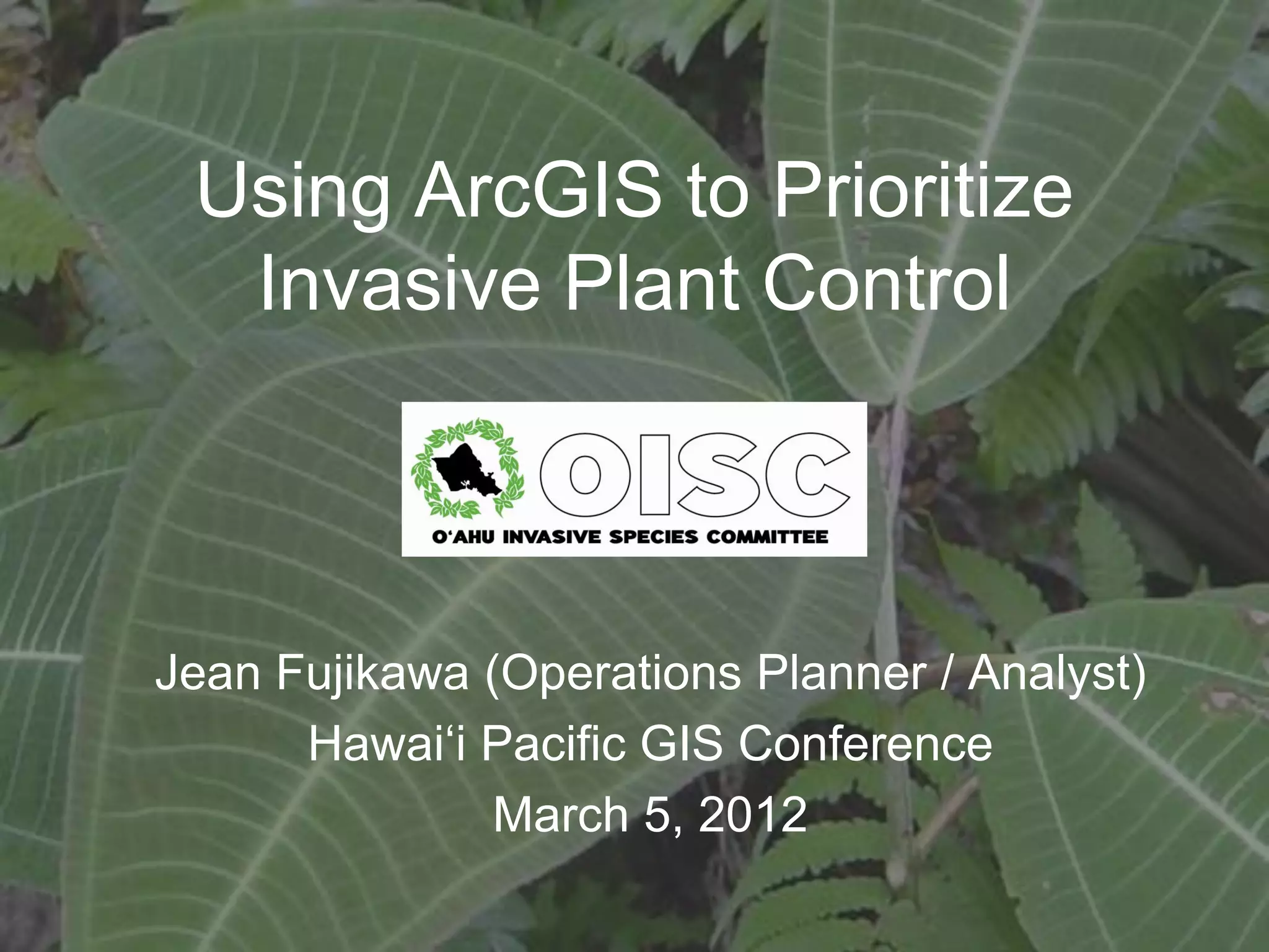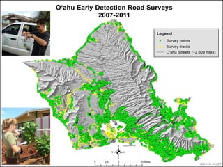 The document discusses how the O'ahu Invasive Species Committee (OISC) uses ArcGIS to prioritize control of invasive plant species on O'ahu. OISC works to prevent, eradicate, and stop the spread of invasive species. It evaluates species recommended by the state using risk assessments and delimits their locations using surveys within 200m and 600m buffers in ArcGIS. This allows OISC to track survey progress, check for barriers to control, and summarize land ownership to obtain access and focus eradication efforts. Using ArcGIS throughout the process helps prevent new invasive species from establishing like miconia and supports early detection and control.