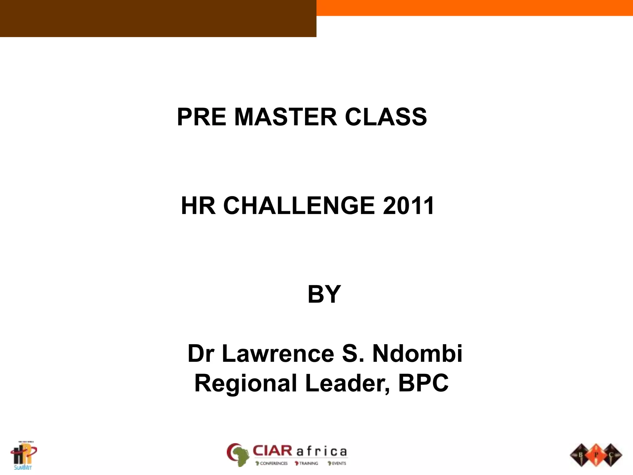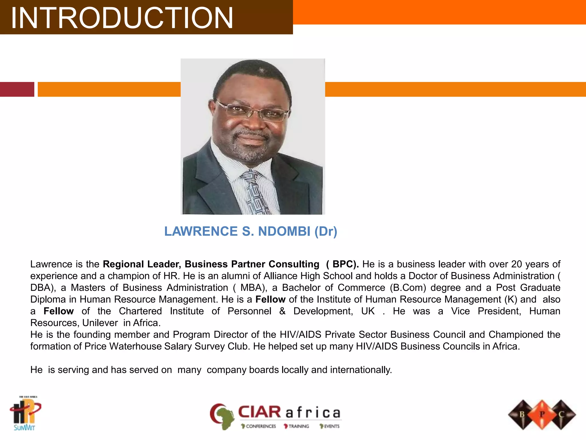 Lawrence S. Ndombi is a regional leader at BPC with over 20 years of experience in human resources. He discusses the changing demands on HR from businesses seeking growth and shareholder value. HR must transform from administrative tasks to strategic business partners that enable business strategies and deliver commercial benefits. Line managers now have increased responsibility for people management tasks. The key HR roles are business partners who help achieve business goals and HR specialists who provide guidance to managers. HR must strengthen its contribution by understanding key business measures and aligning objectives.