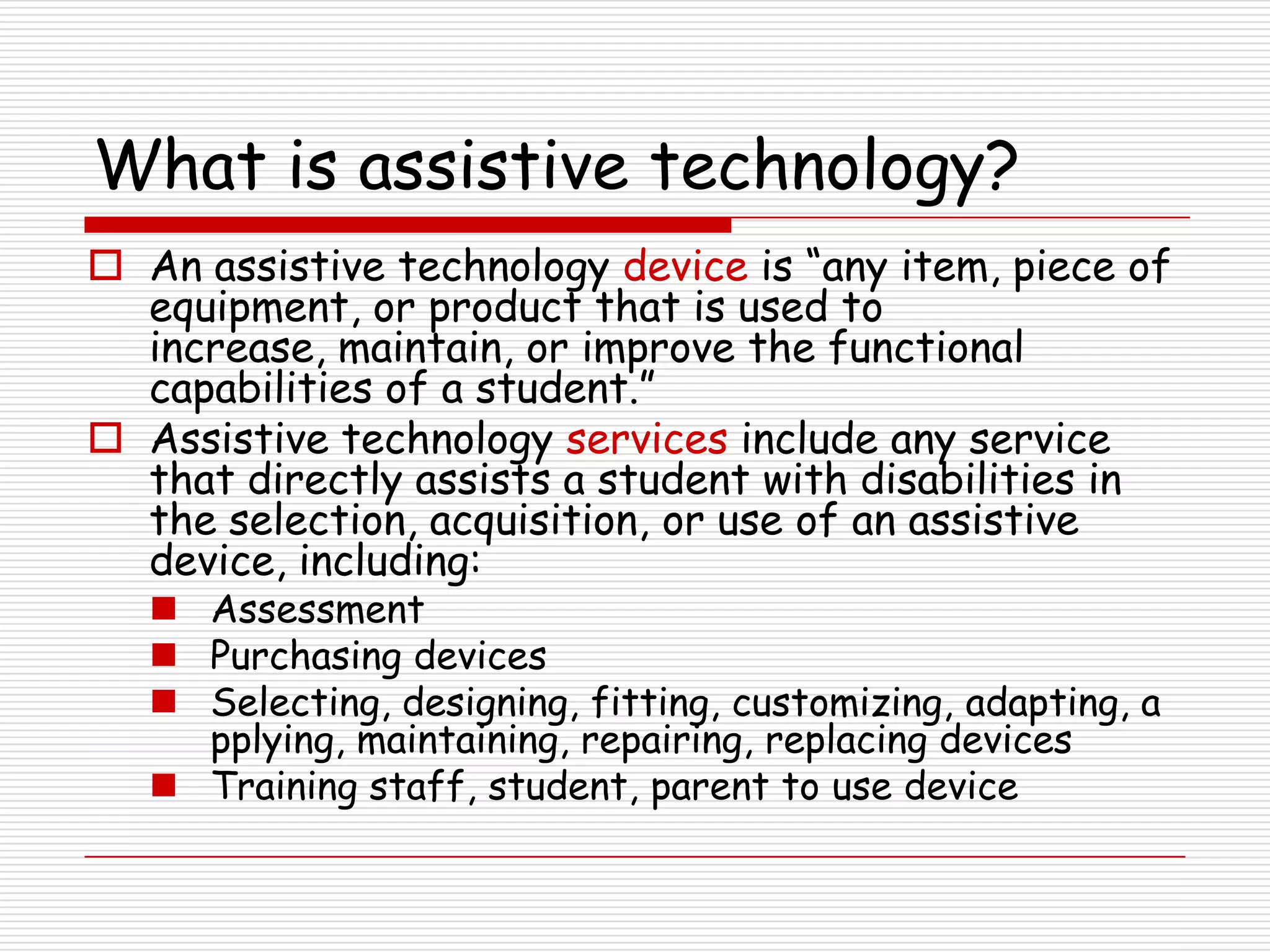 This document discusses assistive technology and how it can support students in the least restrictive environment. It defines assistive technology as any item that helps increase, maintain, or improve a student's functional abilities. The Individuals with Disabilities Education Act requires schools to provide assistive technology if needed for a free appropriate public education. The document then provides examples of low-tech and mid-tech assistive devices that can help with reading, writing, math, organization, behavior, and communication without requiring an assistive technology referral. It concludes by noting the process for submitting an assistive technology referral.