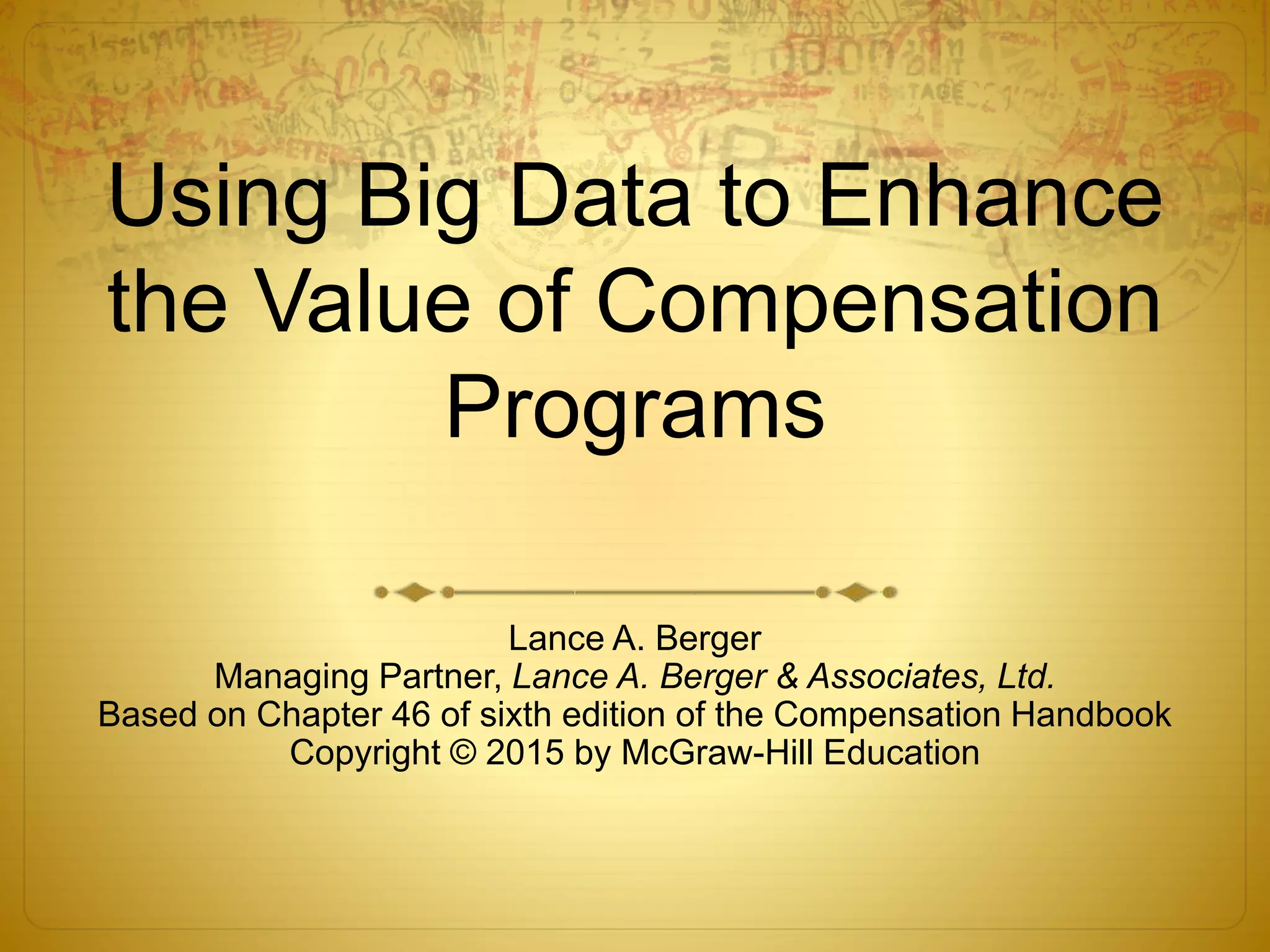 This document discusses how organizations can use big data to enhance compensation programs. It defines big compensation data as integrating data from different areas using analytics to address human resources issues. It identifies five elements of big data: foundational knowledge, levels of implementation, competencies for practitioners, value-creating outcomes, and a blueprint. Big data helps ensure compensation strategies align with business strategies, culture, and talent management to maximize value.