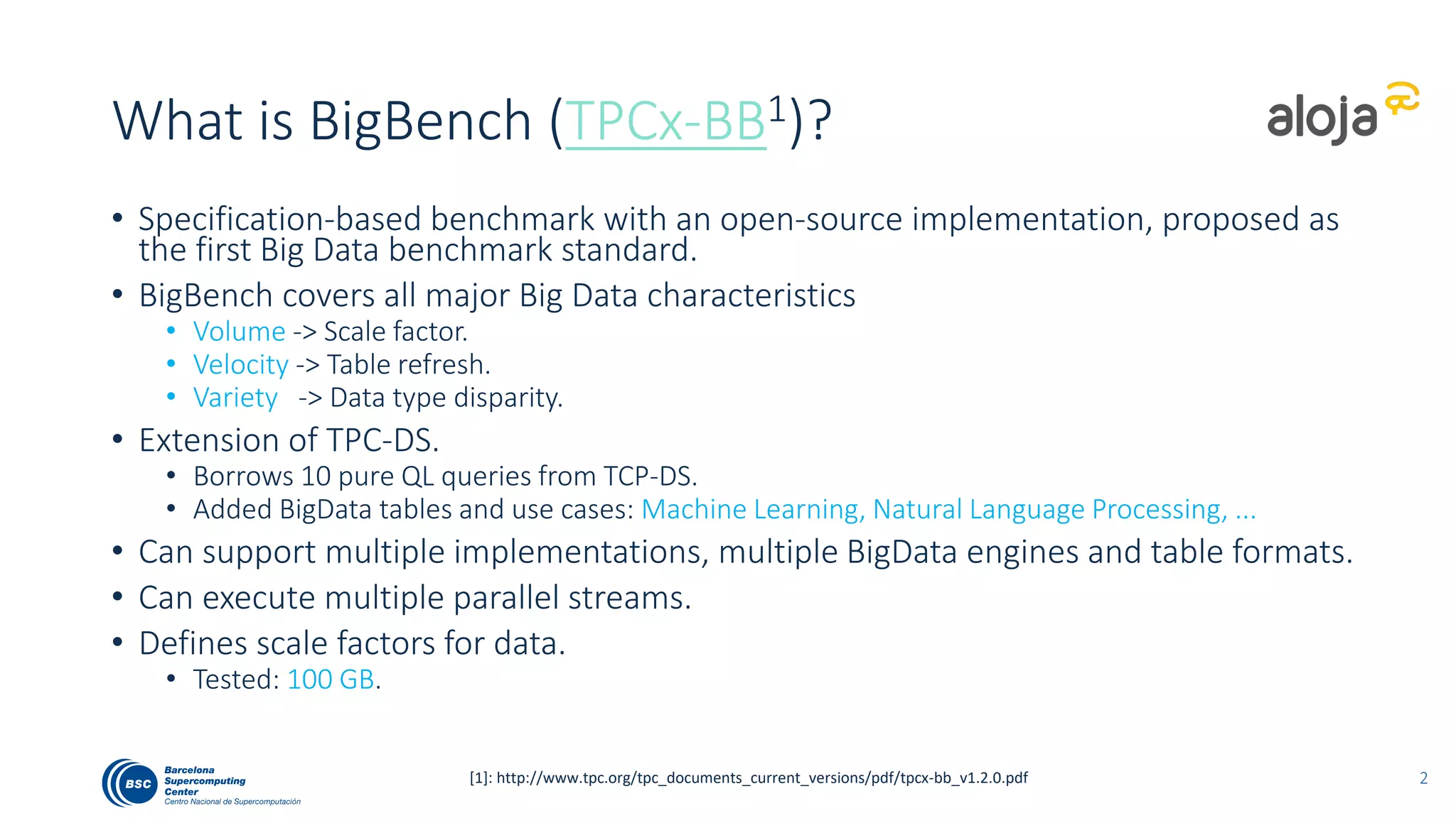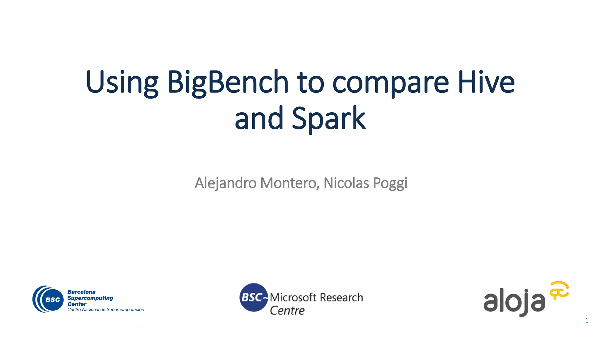 The document discusses BigBench, an open-source benchmark standard for big data that evaluates Hive and Spark using various queries from TPC-DS and additional machine learning and NLP use cases. It highlights the performance improvements of Hive on Tez compared to MapReduce and Spark, and suggests that Apache Tez combined with Spark MLlib is the best approach for production. The benchmark tests a 100 GB dataset across different configurations, revealing Hive on Tez as the most efficient option.