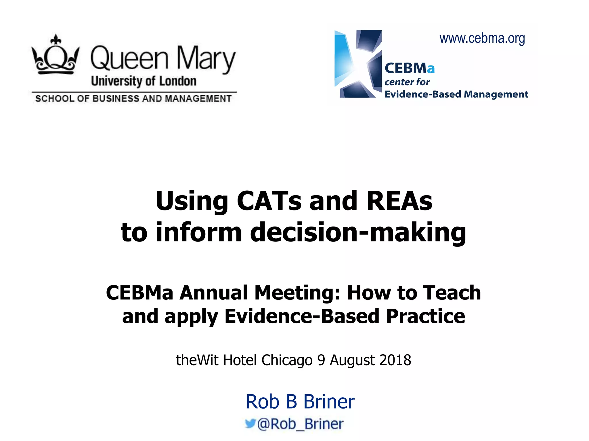 This document discusses critically appraised topics (CATs) and rapid evidence assessments (REAs) as tools for evidence-based practice in management. It provides an overview of what CATs and REAs are, which are shorter versions of systematic literature reviews. The document outlines the core principles of CATs, REAs, and systematic reviews, including being systematic, transparent, replicable, and synthesizing evidence. It also discusses how to structure a CAT and provides examples of CAT topics. Finally, it discusses how CATs and REAs can be used to inform decision making by considering practitioners' expertise, organizational data, scientific literature, and stakeholder values when identifying problems and solutions.