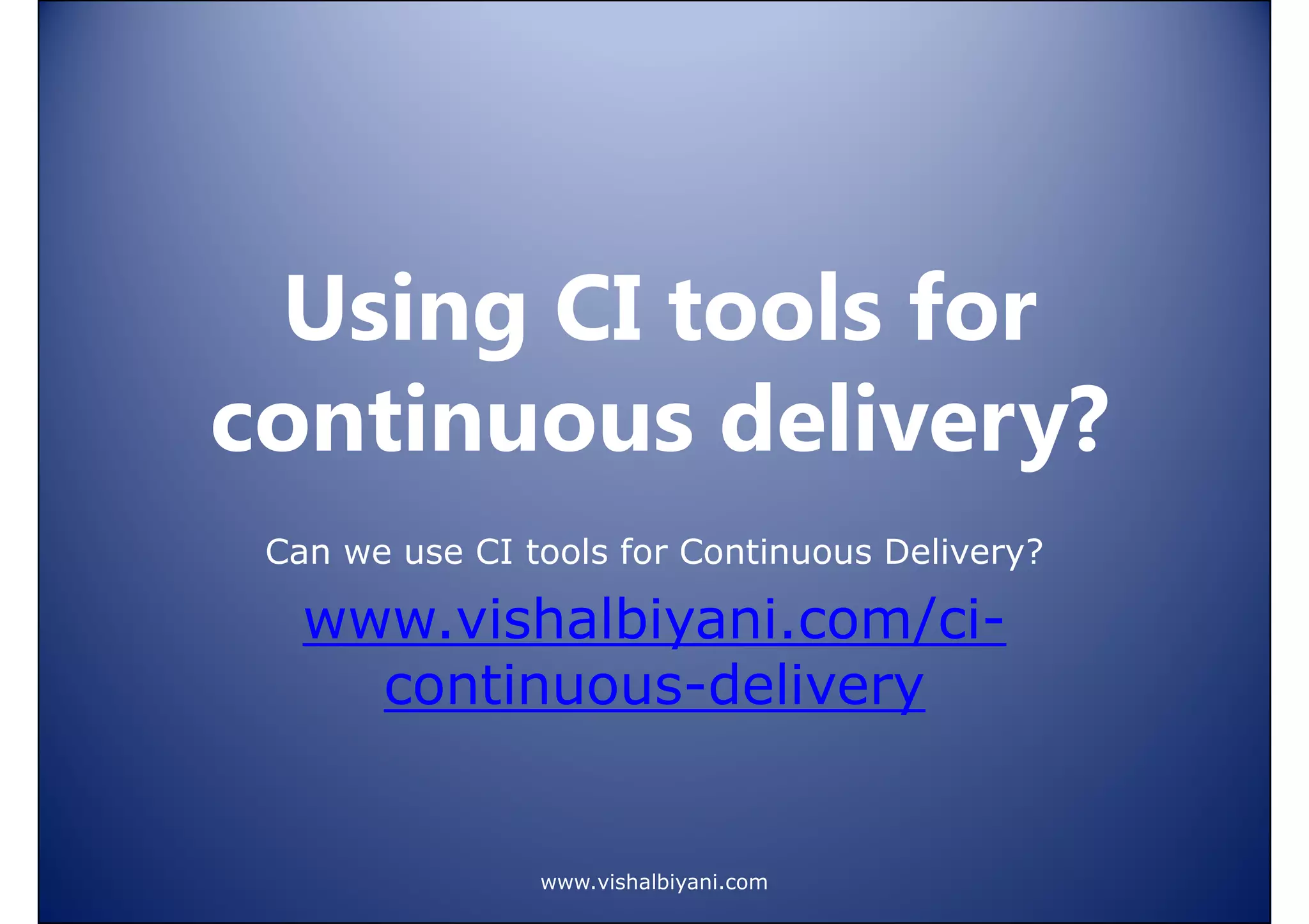 The document discusses the evaluation of CI tools for continuous delivery, focusing on tools like Go by ThoughtWorks, TeamCity, Bamboo, and Jenkins. It highlights key parameters such as support for CI/CD semantics, workflow visualization, extensibility for custom actions, and integration capabilities. The summary covers a rough workflow of testing code commits, creating pipelines, and the various configurations available for successful deployment.