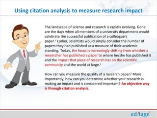 The document discusses the evolving landscape of research publication, emphasizing the shift from quantity to the impact and quality of published works as measured through citation analysis. It explains how citation analysis evaluates the influence of research articles, researchers, and institutions, and the various metrics used, such as journal impact factors and the h-index. However, it also highlights the limitations of citation analysis, advocating for its use as a supplement to expert review rather than a sole measure of research quality.