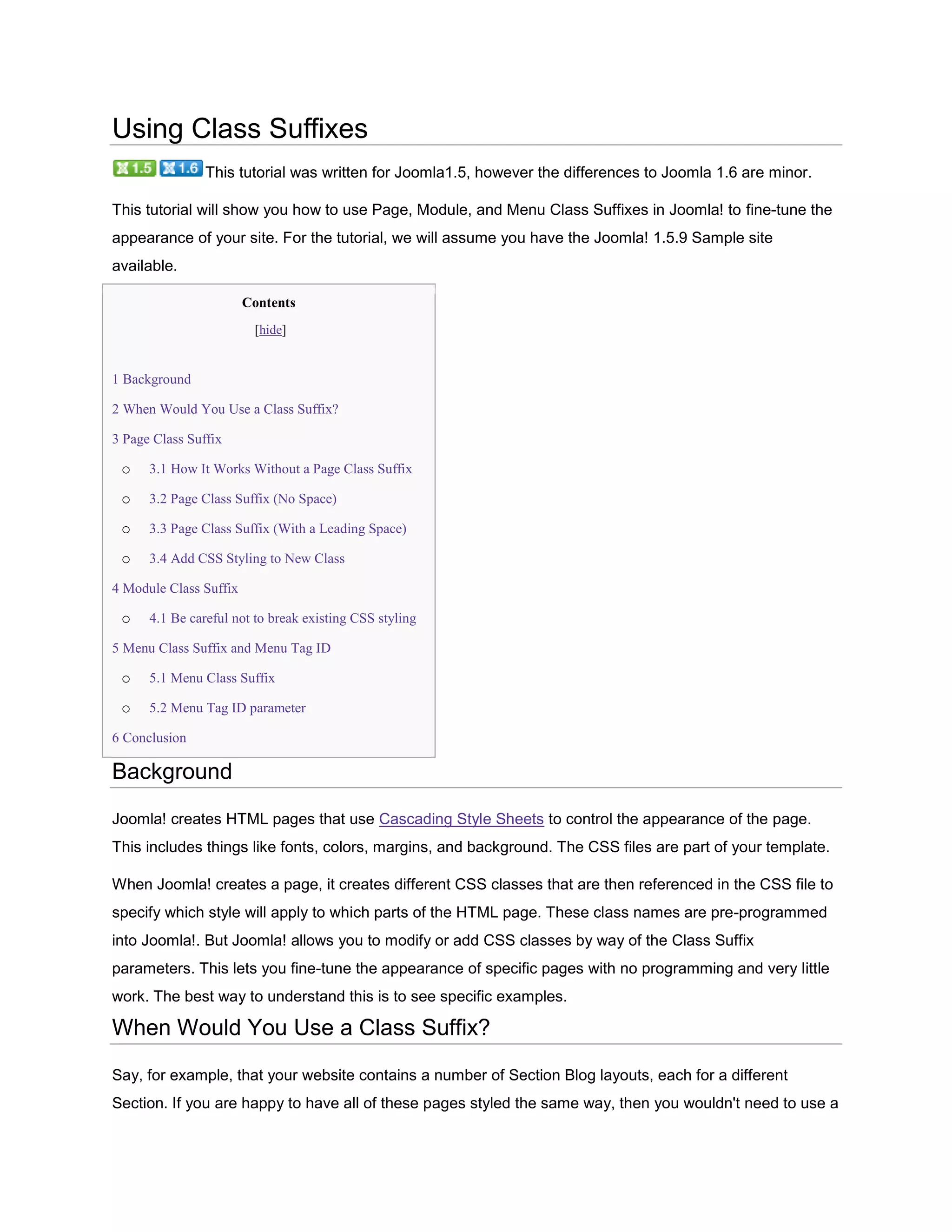 This document discusses how to use class suffixes in Joomla to customize the styling of pages, modules, and menus. Class suffixes add additional CSS classes to elements without modifying existing classes. This allows custom styling to be applied selectively. The key points covered are: