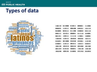 The document discusses the use of clustering in qualitative data analysis, particularly in the context of mixed methods research. It details the process of clustering qualitative data, including data preparation, identification of variables for analysis, and similarity measures for clustering decisions. An example is provided through a Latino grievances project, illustrating how various attributes and coding schemes can be systematically analyzed.