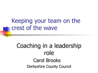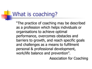 This document discusses coaching and its relationship to leadership. It defines coaching as helping individuals achieve goals and overcome obstacles through personal and professional development. Coaching focuses on raising self-awareness and knowledge. Effective leadership is described as a moral relationship based on trust and shared vision. Coaching principles include awareness, responsibility, and self-directed learning. Coaching tools include active listening, questioning, and feedback. The Grow model outlines setting goals, assessing reality and options, and determining one's will. Coaching cultivates a culture of self-awareness, responsibility, self-belief, and solution-focus to help people achieve their potential.