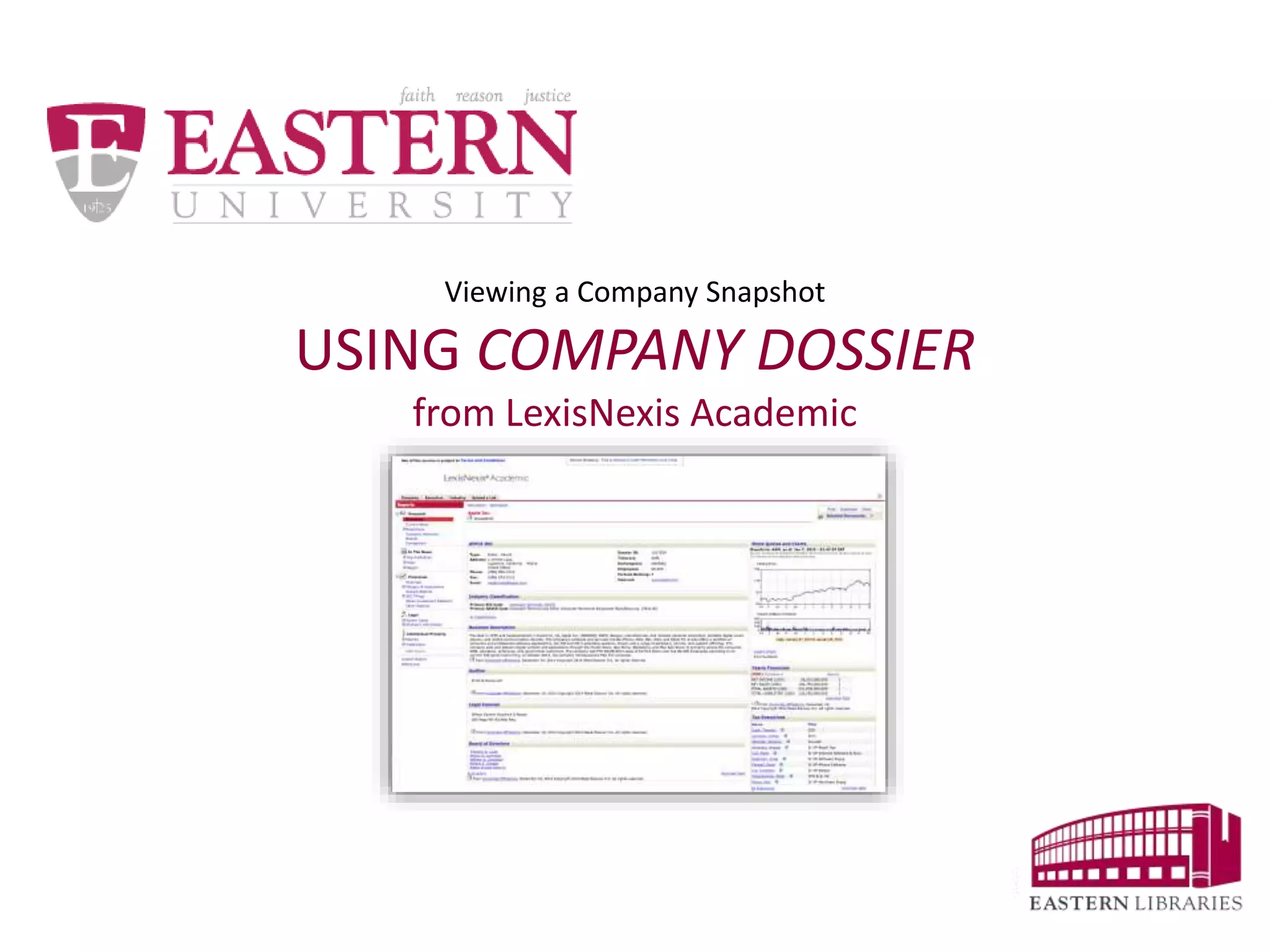 The document explains how to use the Company Dossier feature in LexisNexis Academic to access company information, including basic details, financial snapshots, and news. Users can search by various criteria and view data on company executives, competitors, and related legal resources. Additionally, the document highlights the ability to download financial reports and generate custom reports for efficient data use.
