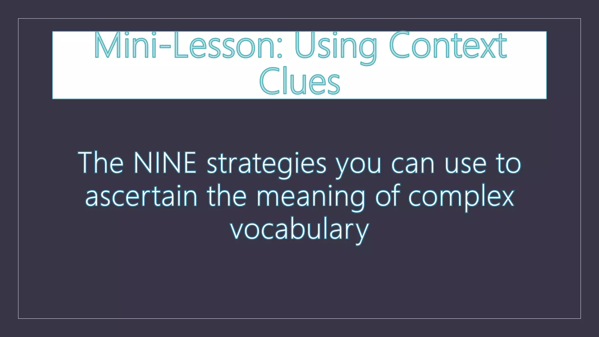 This document provides strategies and examples for determining the meaning of unknown words using context clues. It discusses 9 different strategies: